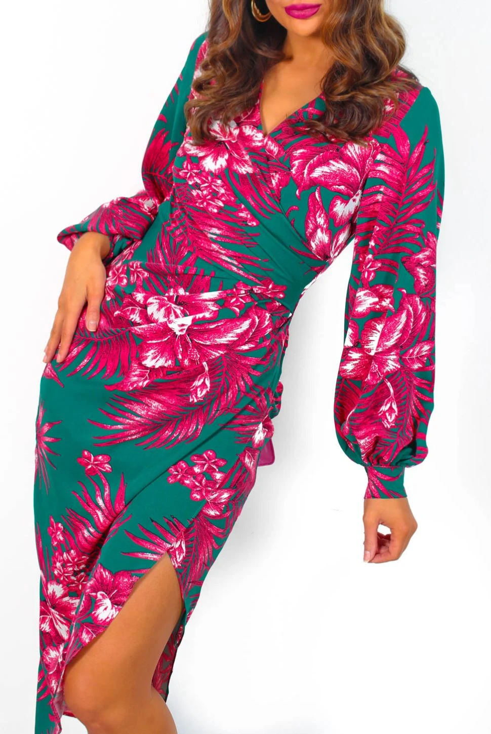 If it’s not florals we don’t want it, Doll! Featuring a gorgeous pink floral print set against our favourite forest green shade, this stunning green and pink floral midi dress features