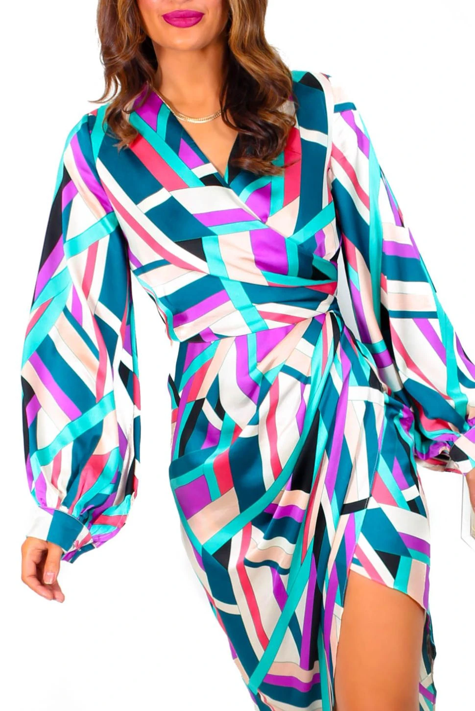 Add an extra touch of class to your going out out wardrobe this season! This stunning midi length dress boasts an abstract print in shades of turquoise, pink, white and purple, has a wrap style v-neckline, long cuffed sleeves and an asymmetric hemline for the best balance of sassy and classy. Match your accessories to your fav’ colour in the print and get browsing the cocktail menu – we’ll have a passionfruit martini please!
