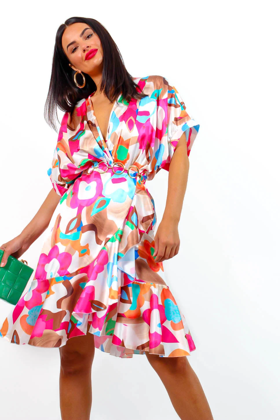 All dressed up, everywhere to go. Featuring a satin style material, a bright floral pattern, a v-neckline, faux wrap silohuette with frill detailing, and short sleeves. Style with cute pink sandals and a mini bag for a seriously chic holiday fit.Â
