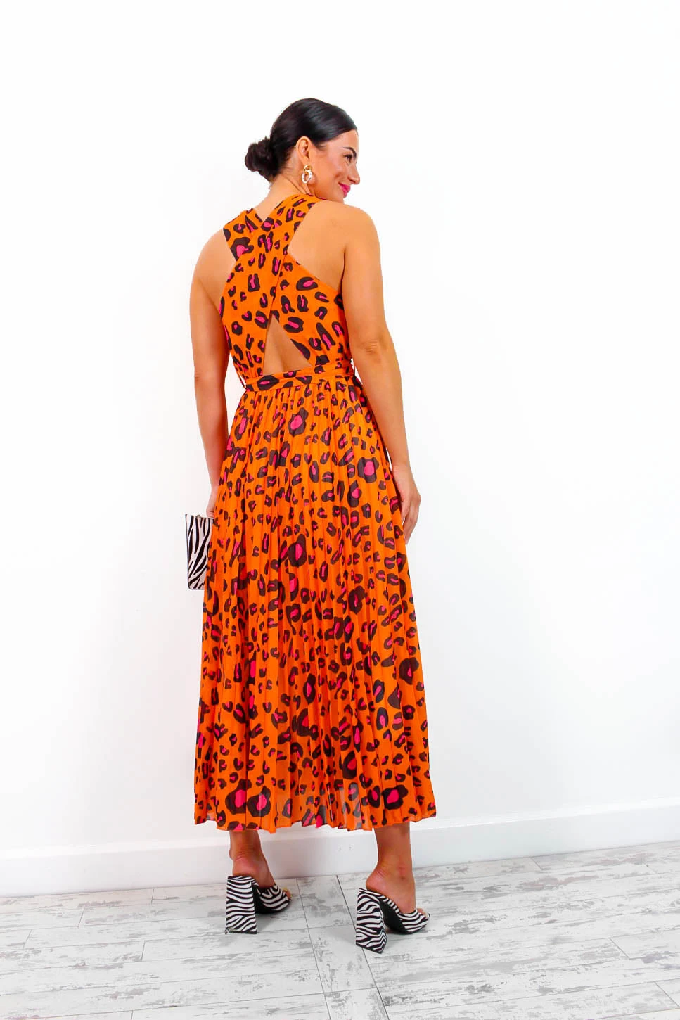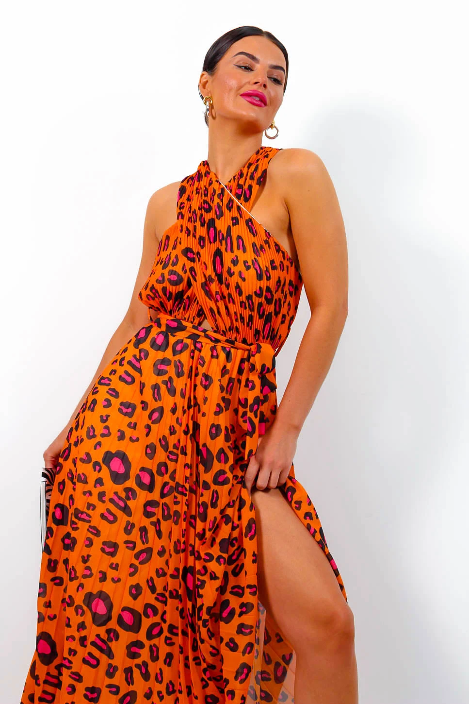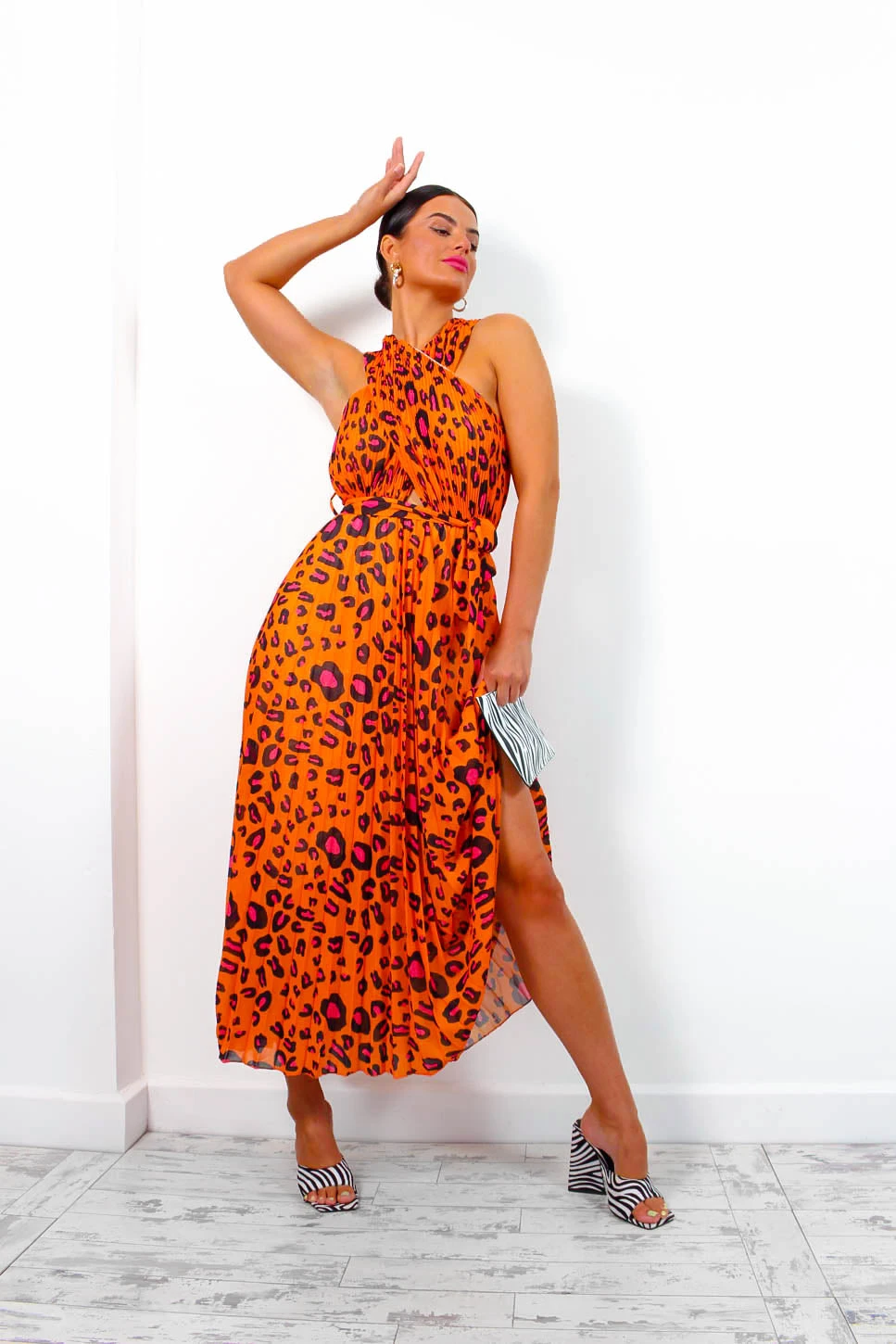 What a colour combo! We love mixing a little class with some edge and this dress is the perfect concoction of both. This stunning maxi dress features an orange and fuchsia leopard print, a cross-over detail neckline, an empire waistline, and a tie belt to shape. Any accessories will look perffff just remember to bring that attitude.