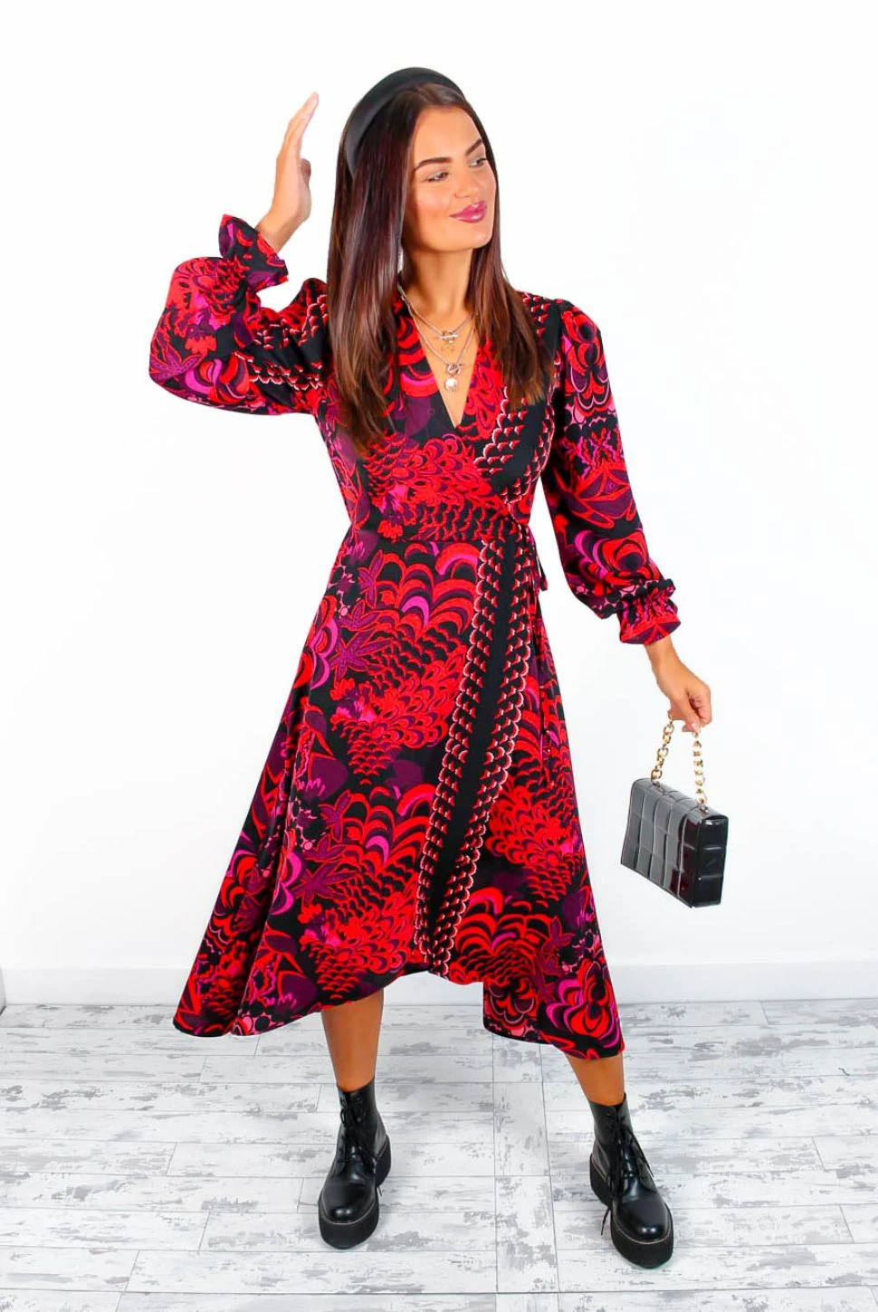Get red-dy for the night of your life! This fabulous midi wrap dress features a red, black and purple multi mixed print that’ll turn heads wherever you go. Finished with long puff sleeves with elasticated frill cuffs, an elasticated wrap-look waist, zip back opening and flowy midi length hemline. Wear with pink or purple accessories that pick out the dress colours for added style points.