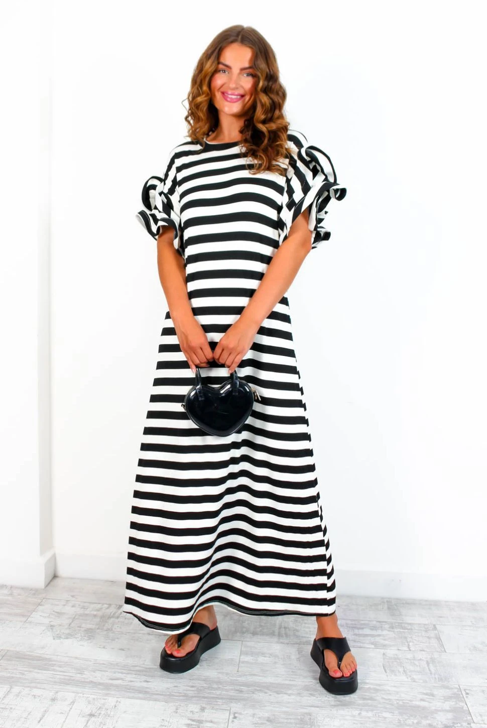 Feelin’ fine! Take off-duty to the next level in this monochrome maxi dress. With a comfortable stretch material, boasting flouncy ruffled sleeves and a sleek black and white stripe pattern, this day dress is sure to make a statement! Slip on with chunky boots and a bold lip for an effortless but utterly fabulous day-to-day look. Casual never looked so good, Doll.