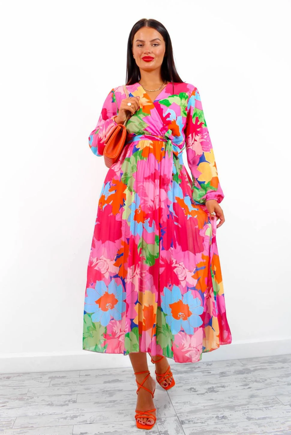 Bloom baby bloom! Get ready to channel your inner floral goddess and turn heads in this stunningly sweet midi dress. Featuring a punchy pink and multi floral design blooming throughout the classic pleated fabric, it’s complete with the matching belt that cinches the waist for a truly glam, figure flattering look. Perfect for Spring garden parties, dress down with a matching zesty orange sandal and crossbody bag combo.