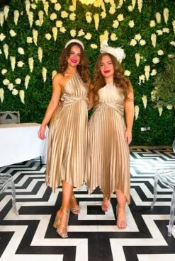 Let’s raise a toast to the dream wedding guest dress! Make sure you’re the one to watch at those big events this Spring in this pleated taupe one shoulder dress. In all-over silky champagne neutral with a spectacular statement knot front and draped pleat design, you’ll look every inch the dreamy Greek goddess you are, Doll! Whether it’s race day or your bestie’s big day, make the dress fizz with glittery golden accessories and a nude lip for an elegant and effortlessly stylish day-to-night look.