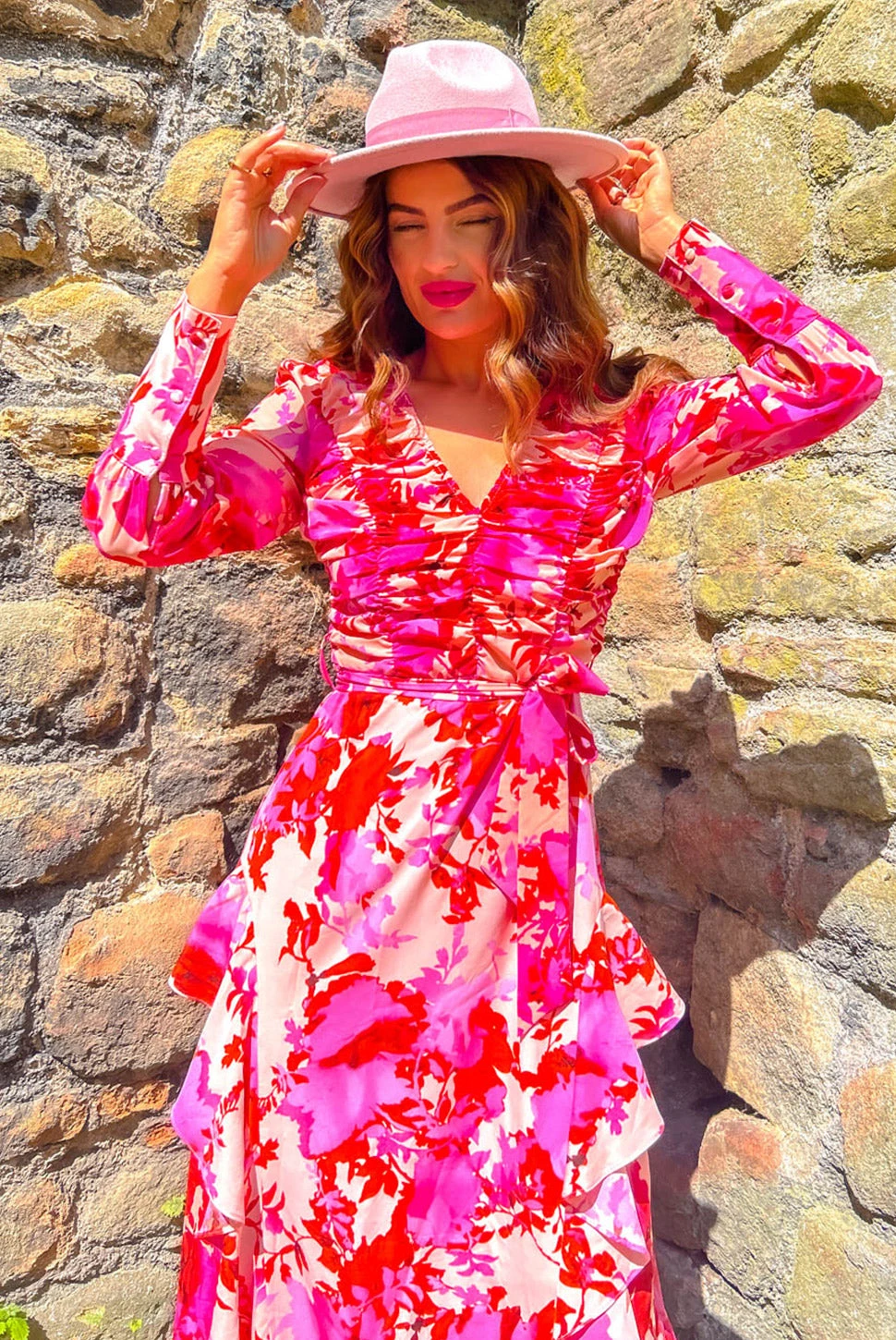 Got it? Flaunt it! Feel the flirty fantasy in this floral ruffle midi dress. Blooming with the prettiest pink and peach floral print, this romantic pink floral midi dress with sleeves is complete with a plunging v neckline, matching tie waist, and a tag team of rouching and ruffle hem details to help you look your fiercest self. Your new go-to for any dressier occasion, just add barely there heels and all-gold accessories to show off your flirty side!