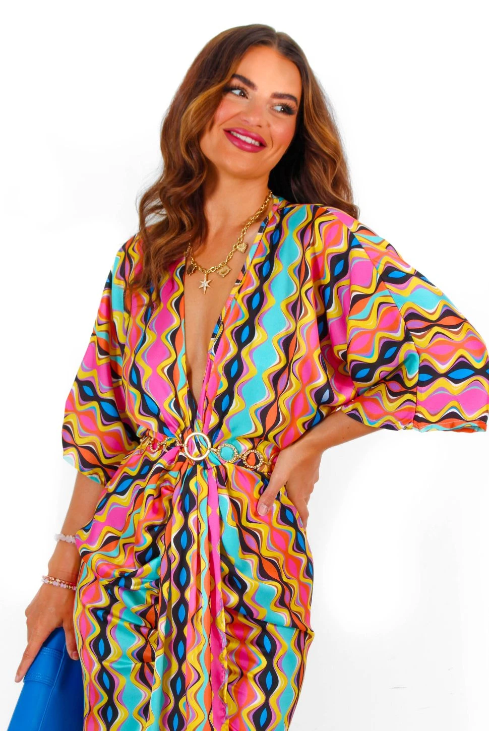 What you’ve got is hard to find, Doll! With flowing batwing sleeves and a daring plunging crossover neckline, this abstract printed midi dress is sure to get those heads turning – it’s a satin technicolour dream! Complete with a subtle leg split and draping detail, we’ve found our dress for this weekends plans.Â