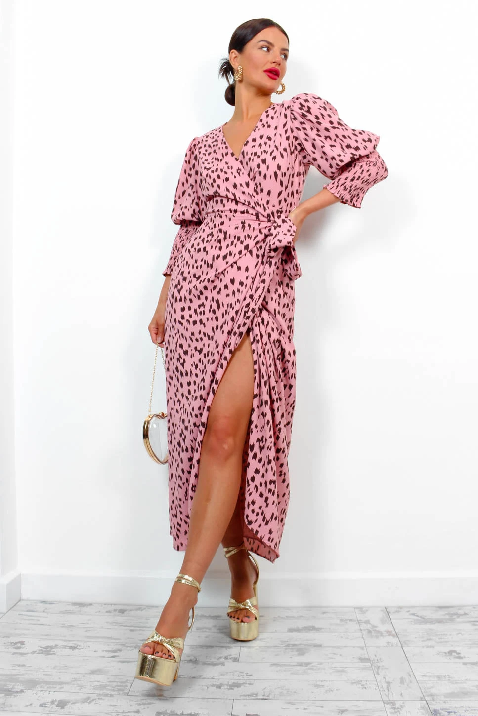 All these compliments are making us blush! This fun and flirty midi dress is perfect for anything from date night to wedding receptions! In a fierce blush and chocolate brown abstract animal print throughout, 3/4 shirred puffed sleeves, and a wrap-style front which can be worn v-neck, plunged or even reversed! You’re never fully dressed for a glam night out until you’re dripping in gold accessories, go for a matching bag and heel and you’re good to glow.