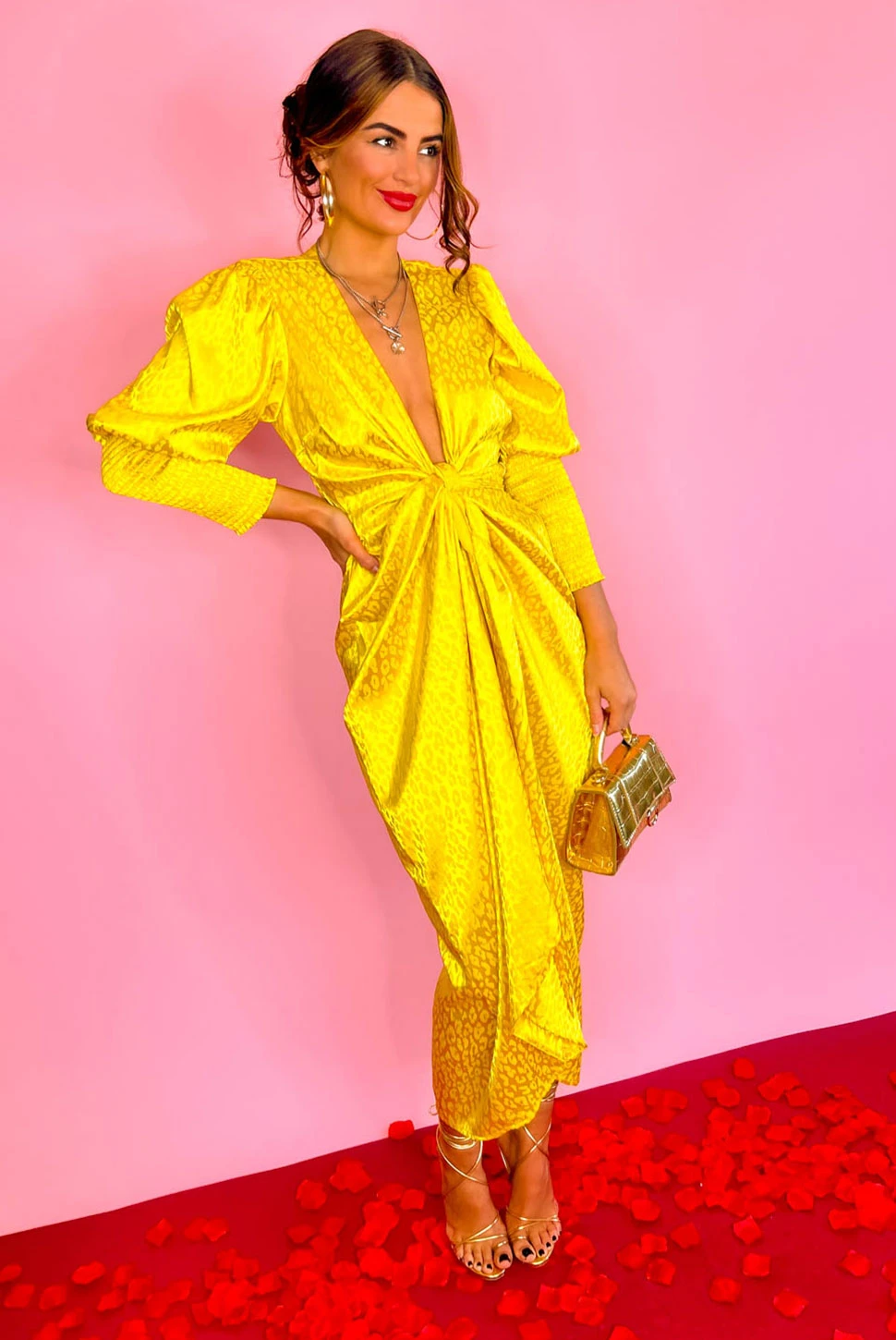 She’s a glow-getter! This radiant midi dress features a leopard jacquard print on a satin mustard base. Complete with 3/4 shirred sleeves, and a wrap-style front which can be worn multiple ways! Colour clash with a pop of cobalt blue killer heels for a statement look that will have heads turning.