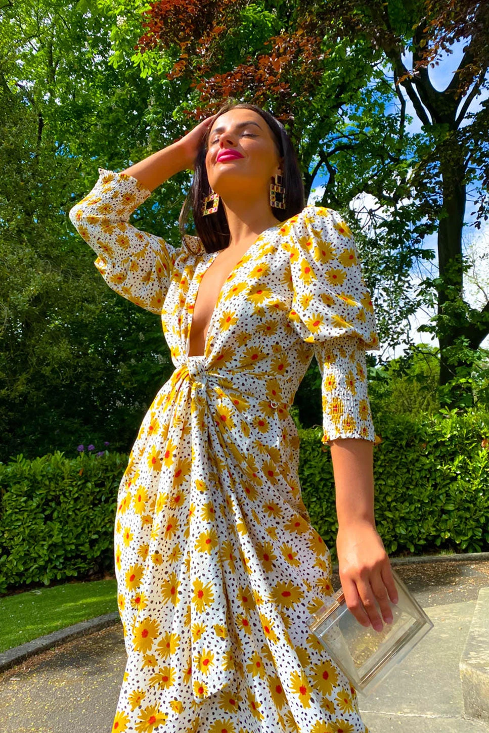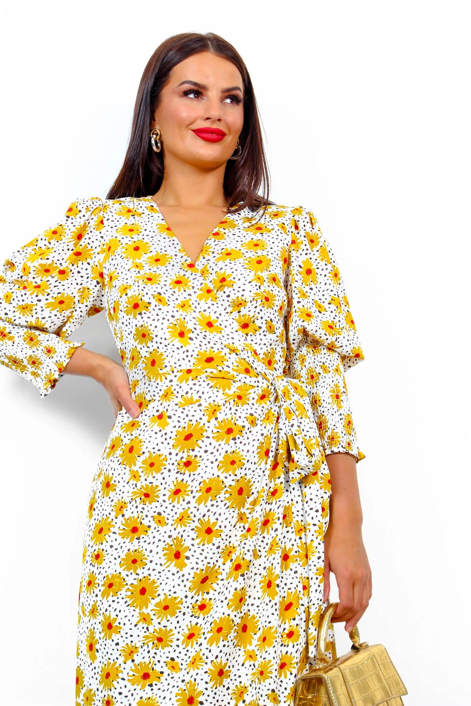 BRB, having a spring fling with this dress. This number comes in a yellow floral print with contrasting dots throughout, perfect for transitioning into spring! featuring shirred long sleeves, a flowing hem, and a wrap-style fastening that can be worn multiple ways. Go bold and pair with some mustard shoes for total spring vibes.Â