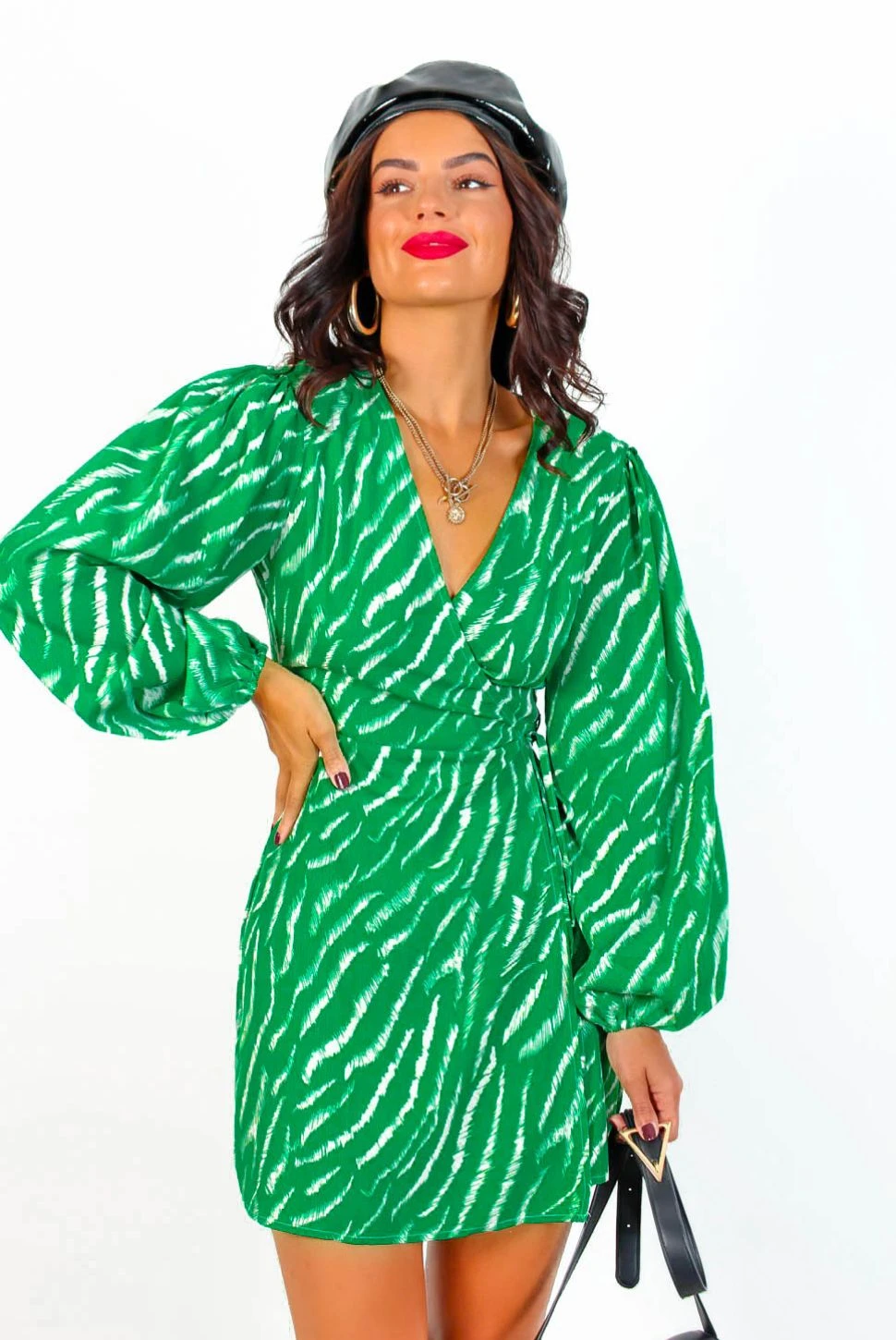 Our first love: animal print. This mini wrap features a bang on trend green zebra print design, wrap style fastening, floaty hemline, and cuffed loose sleeves. Style casual with chunky boots, and a leather jacket. Add a red lip for that pop of drama we live for.