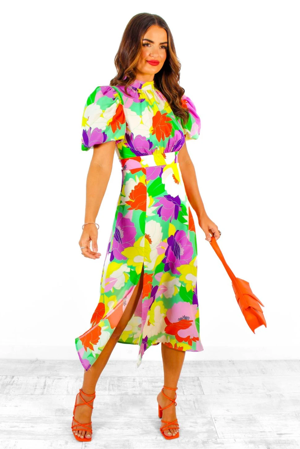Looking good, petal! Let your Spring style bloom in this Doll-fave fun and flirty floral midi dress. Blossoming in beautiful green and purple floral-print, this super flattering midi will make you the pick of the bunch with its short puff sleeves, high neckline, and sassy side leg split. Perfect for bringing out the wildflower in you, simply style with pink colour pop accessories for dinner-then-drinks days.