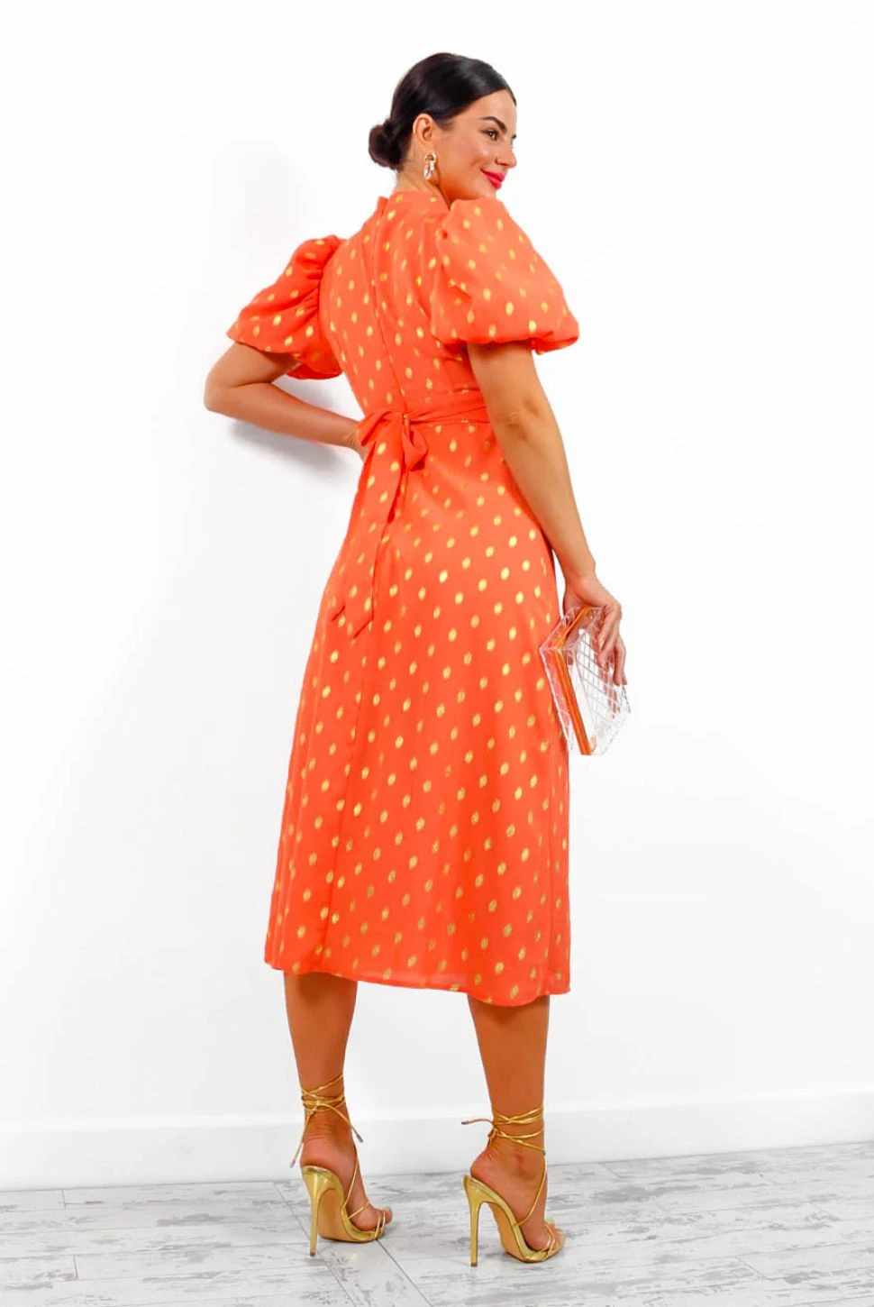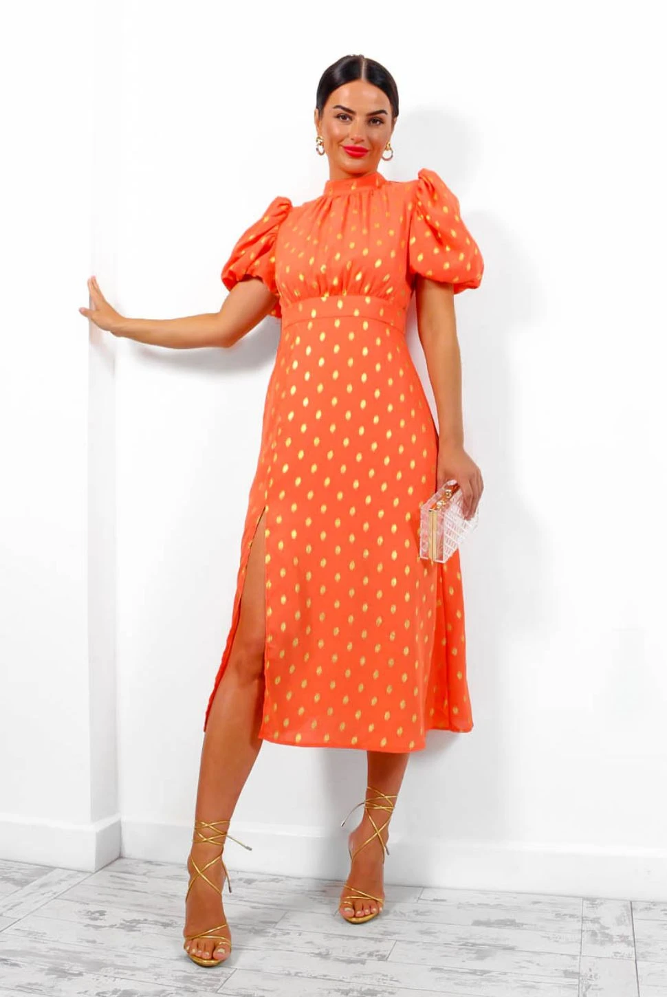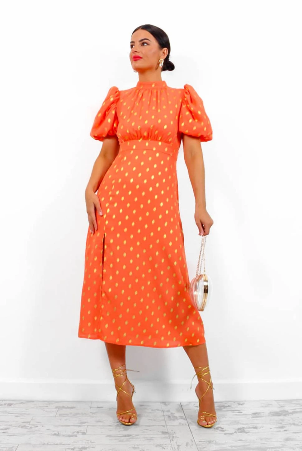 Introducing your new occasion dress! This show stopping zesty orange midi is adorned in gold foil spots throughout giving it the ultimate luxe look. Complete with short puffed sleeves, a modest high neck, and a sassy leg split, plus a material tie on the rear to cinch and enhance the silhouette. Gold is a must for the occasion season so pair with gold heels and accessories for the best-dressed guest.Â