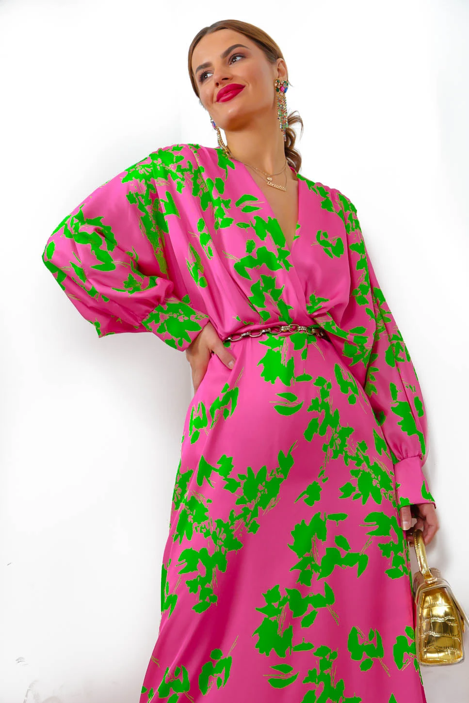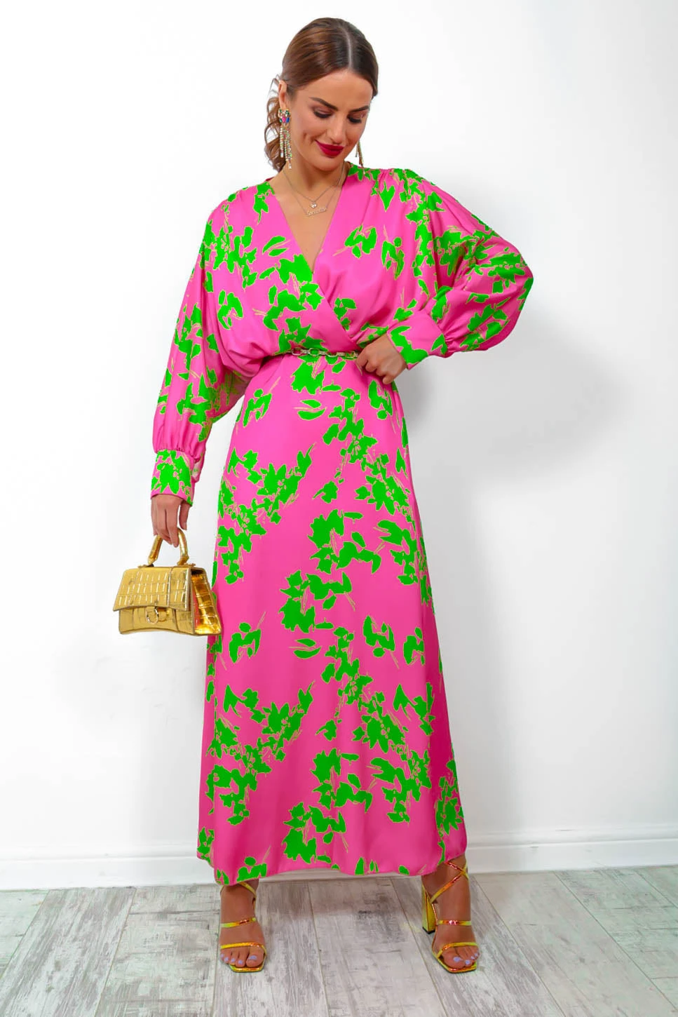 Baby, you look good in pink! This saucy number features a satin pink fabric with a lime green floral design, a midi length, flowing hemline, v-neckline, and those incredible batwing style sleeves. Add gold everything, we love a classic pink and gold combo.