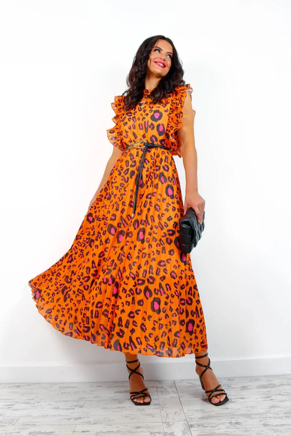 Mamma mia, leopard print again? Obviously. This stylish maxi dress comes in a stunning orange fabric with a fuchsia and black leopard print design and features a v-neckline, frill detailed bodice, and pleated circle skirt. Style with fuchsia accessories, a smokey eye, and a badass attitude.