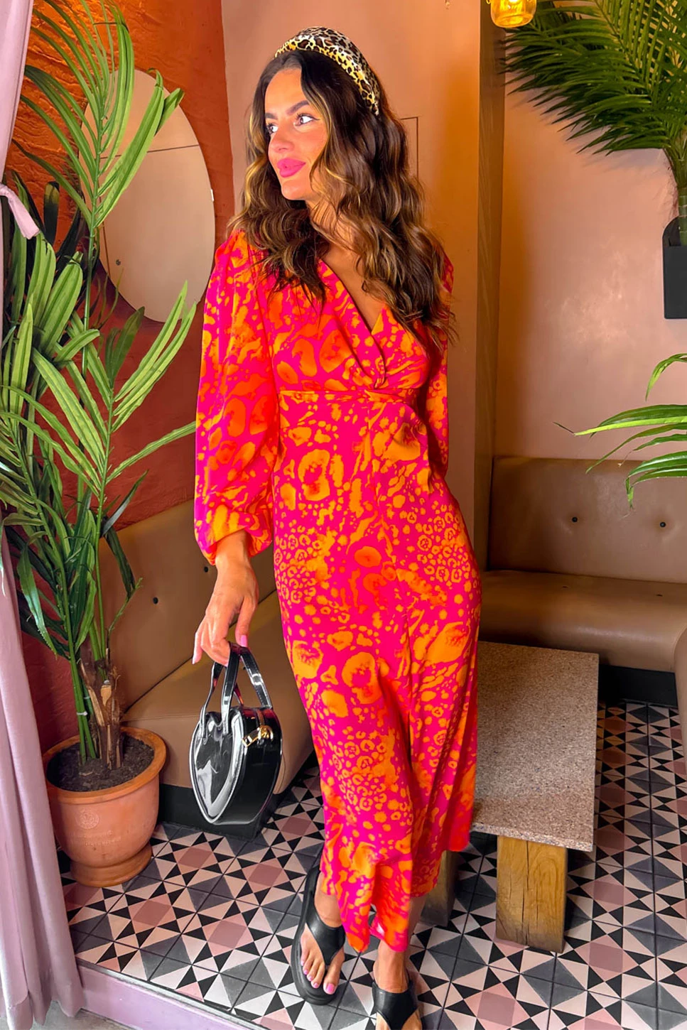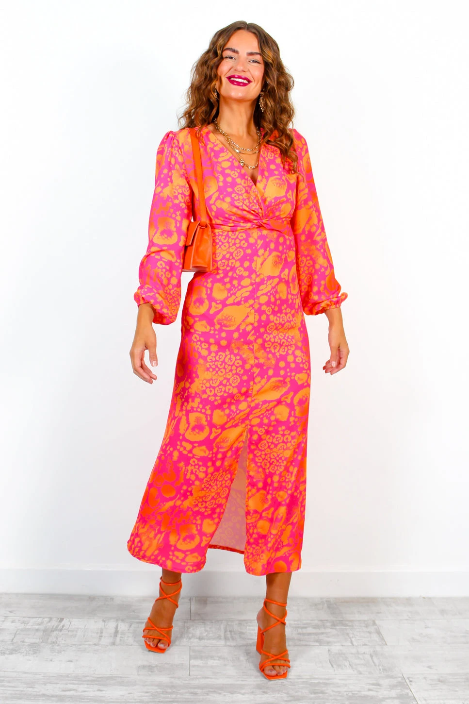No regrets, only fabulous fashion choices! Embrace your inner fashionista and make a fearless statement with this midi dress that exudes confidence and style. With a sassy front split the abstract print and vibrant colourway adds a burst of personality while the twist front detail cinches the waist creating a flattering fit. Strut your stuff in zesty orange accessories to leave a colour popping impression at any event your attending.Â