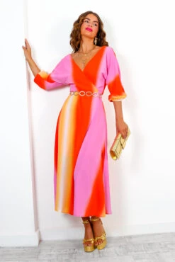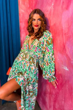 This dress isn’t just a vibe, Doll, it’s a whole mood! They’ll all wanna be feeling bohemian like you in this flirty and forever-flattering long sleeve boho midi dress. Layered with a stunning greens and earthy tones with a pop of magenta, this dreamy midi dress is tribal printed throughout with batwing sleeves and wrap-look waist. It’s our current Spring fling. Style with a neutral western boot for prairie girl vibes or sling on strappy heels to spice up nights out-out!