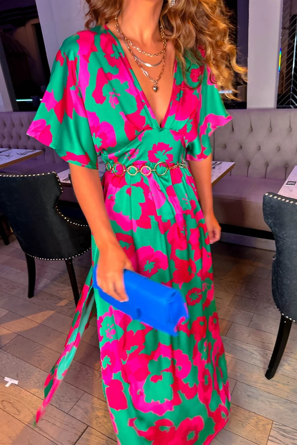 Your chance to dazzle only comes once in a lifetime… or twice a weekend if you’re like us! In a silky satin feel from head to toe, this green maxi dress is flourishing in pink floral print throughout, complete with a flowy hem, plunging V neckline, and floaty half sleeves for added drama. Perfect in pink is the vibe for accessories and you’re ready and raring to go for that wedding you RSVP’d to.