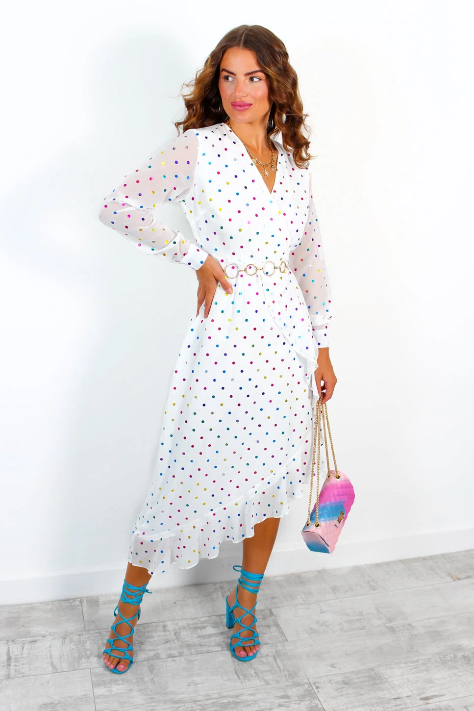 You’re sooooo out of their league, Doll! Live life in full colour in this fresh white dress with shimmering multicolour foil polka dot print throughout. In a midi length, this flirty silhouette is complete with long sheer sleeves, cross-over waist and seriously sassy side split frill hem. Slip on your highest heels and don’t forget those glam accessories. Brace for complements…