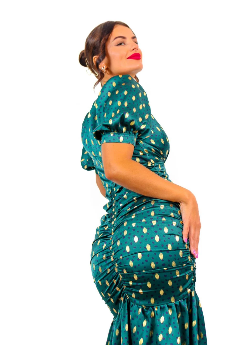 Auto response: Sorry, we can’t talk right now because we’re too busy obsessing over this dress! In an opulent forest green, animal printed and peppered in gold foil spots this midi dress has puffed short sleeves and a bodycon skirt leading into the most beautiful swishy peplum hem – it definitely gives the WOW factor. All you need is some fine gold jewellery and gold heels to complete this look. Prepare for all eyes to be on you, Doll!