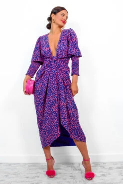 Glamorous Drive Em Wild – Navy Pink Leopard Midi Wrap Dress