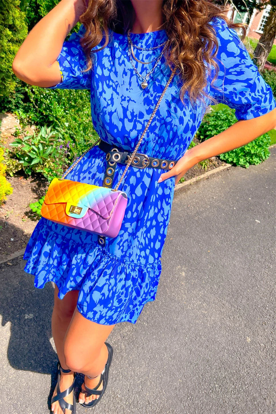Your dress is perfect darling! This charming mini dress features is roaring with a striking cobalt leopard print. Complete with a rounded neckline, short sleeves, an elasticated waistline, and a frilled hem. Team with sandals for holiday plans or blue strappy heels for brunch dates with the girls.