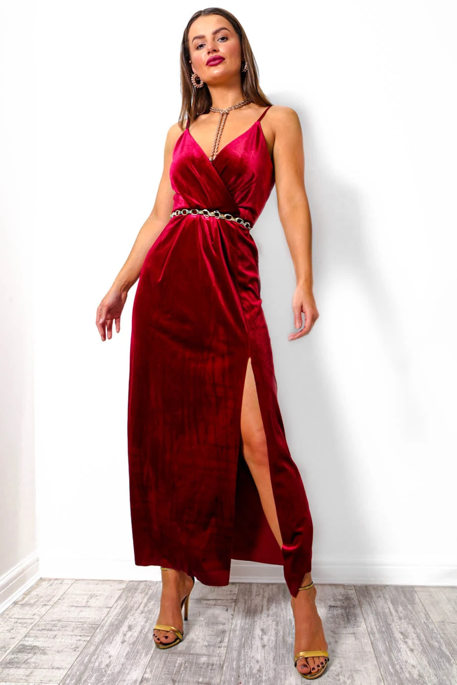 Go all-out glam this season, Doll! This sophisticated floor-length velvet dress comes in a rich wine velvet fabric with spaghetti strap cross-over bust, elasticated waist to flatter your figure, and a fierce leg split at the bottom. Perfect for those who love a 20s moment! Pair with killer heels, a striking red lip and matching glass of red.