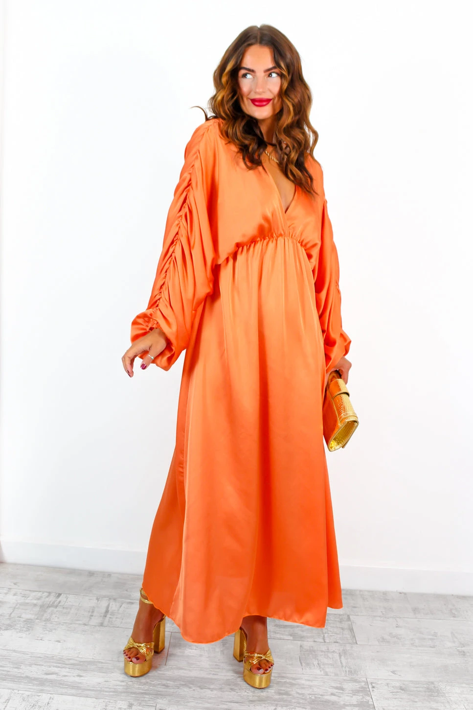 Make some serious fashion waves in this one-of-a-kind zesty orange maxi dress. Its satin fabric and cinched elasticated waist gives you all-day comfort and the perfect flattering fit, while the long ruched sleeves give the dress an edgy twist that’s sure to leave an impression! Who says everyday style can’t be striking? Slip on with chunky white trainers for a stunning dressed down look.