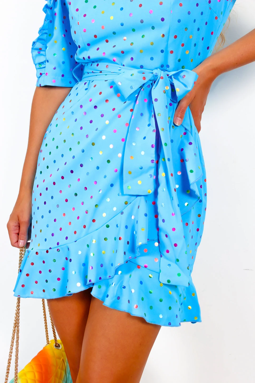 She’s a frill seeker! Taking things to the next level with dramatic frilled sleeves and complete with a matching tie belt to shape and cinch, this vibrant turquoise mini dress will have you dazzling wherever you’re off to with the multicolour foil spot print. Need a little added flair? Look no further than the flirty frilled hem wrap look skirt. For a festival look that’s sure to have all eyes on you, throw on those chunky boots and a grungy gold eyelet belt.