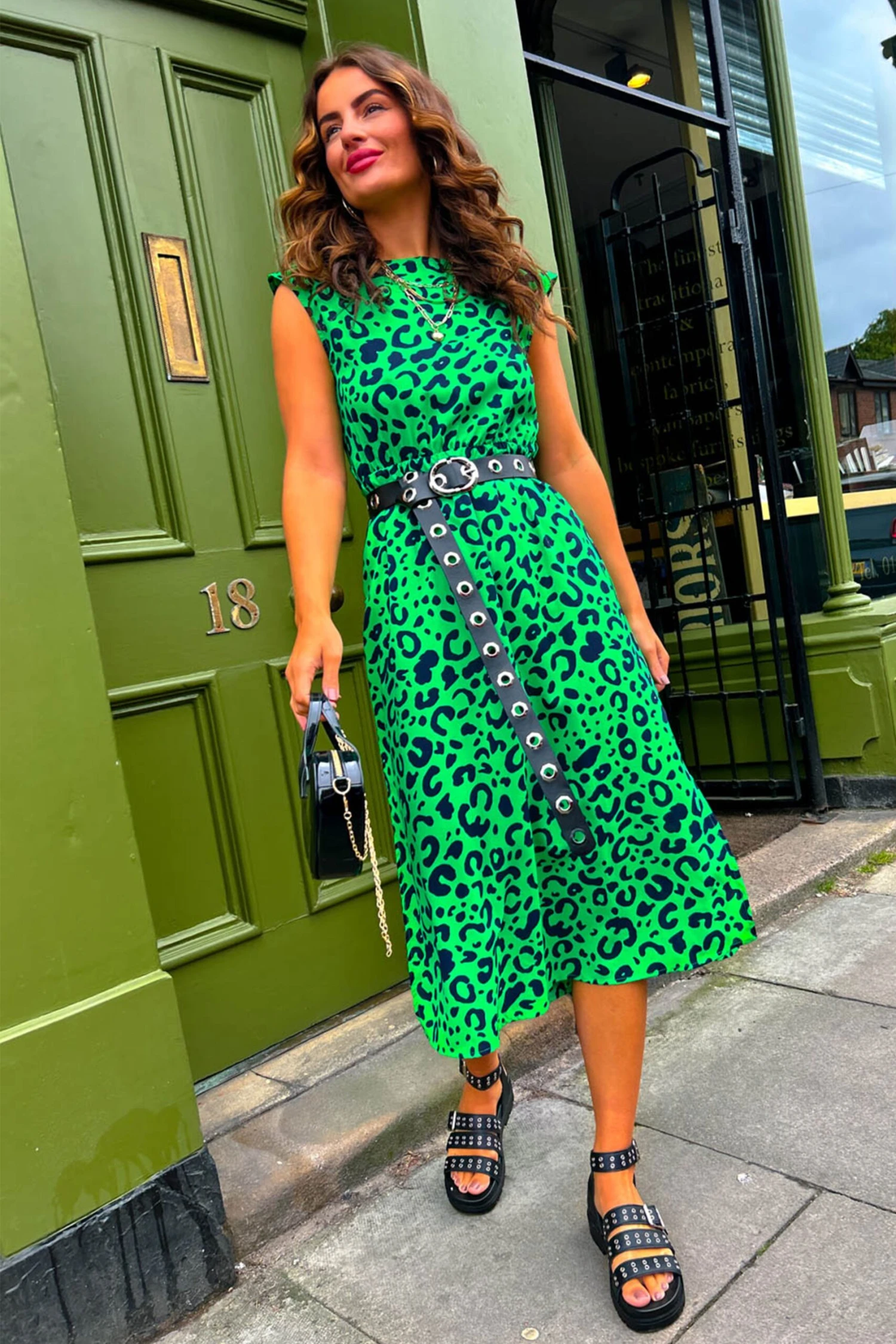 Spotting you in a crowd? That’s easy, baby! Look fierce at your next get-together in this stunning leopard print midi dress. Featuring a green base with black animal print, this sleeveless stunner features subtle shoulder pads, a removable fabric waist tie and two side leg splits for added flirty flair. Team with strappy black sandals and a slick of red lipstick for a look to drive the bar wild!