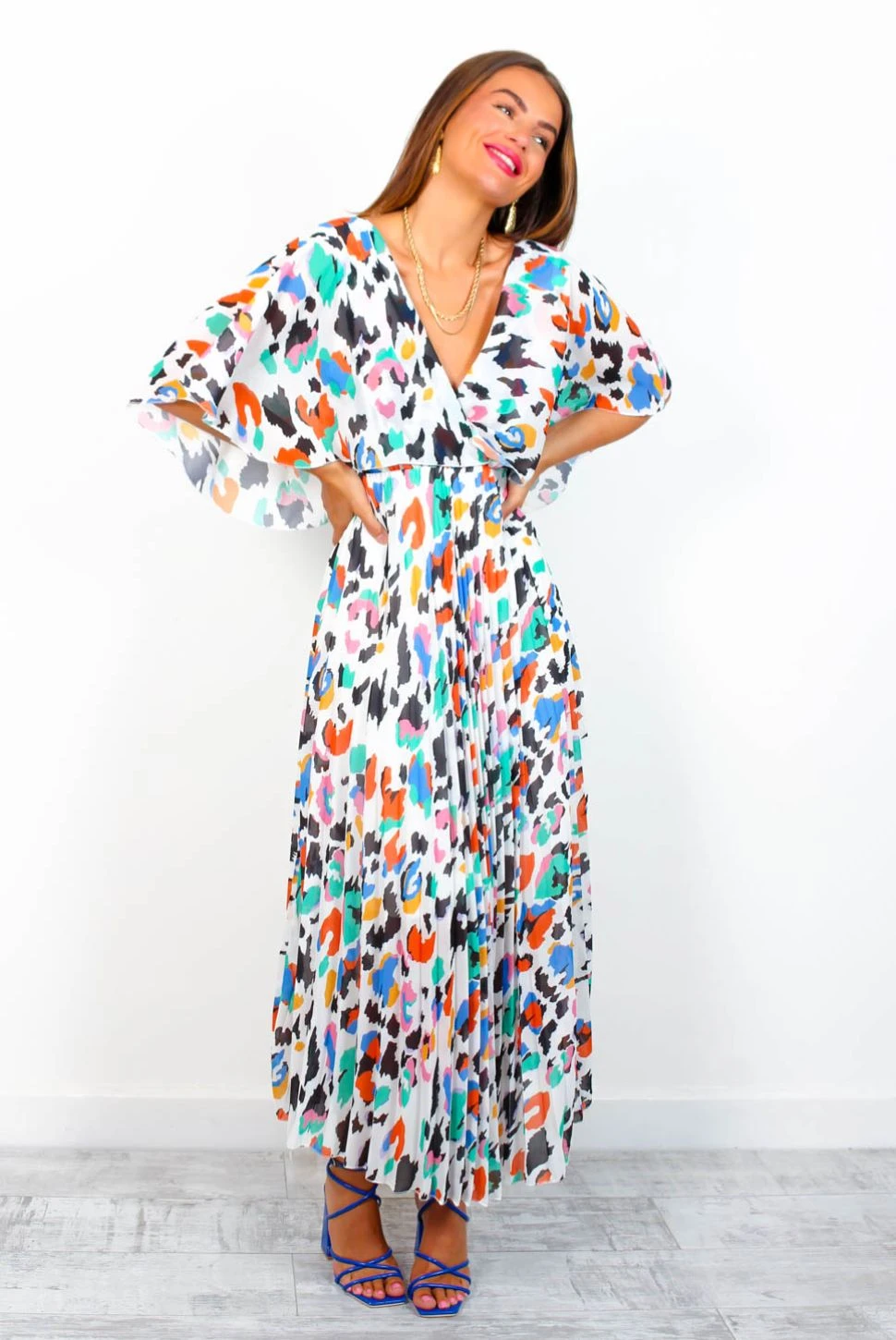 Timeless – White Multi Animal Print Pleated Midi Dress