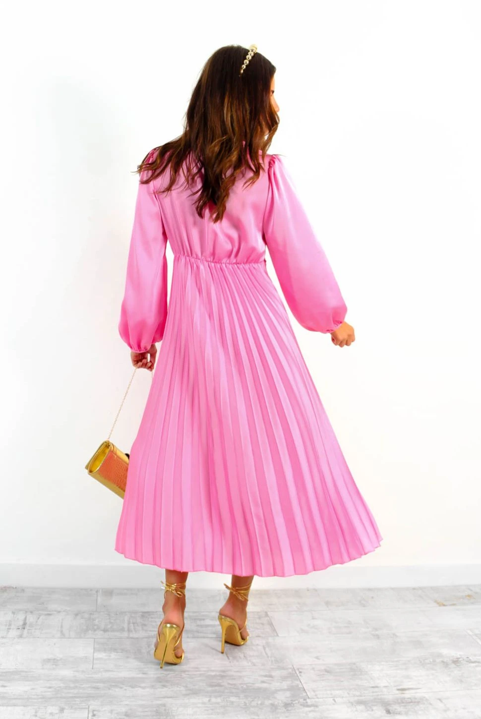 Get ready to twist and shout in this stunning pink pleated midi dress. In a satin finish with a statement twist front detail, the stunning pink throughout is a breath of fresh air as we step into Spring time. For an eye catching but elegant and sophisticated look that will take you through from the day time do to the evening soiree, pair with matching pink accessories or colour contrast like a queen with orange.Â