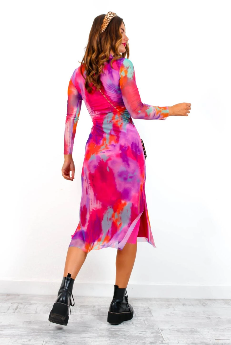 This tie dye number is sitting firmly at the top of our utterly obsessed list! Mesh all over and a mesmerizing pink and lilac toned tie dye print, this bodycon midi dress features a high neck and a trendy double leg split. We’ll be wearing this at any opportunity! Killer pink heels, oversized leather jacket and a sleek low bun gives this ‘fit a total cool girl edge for drinks with the Dolls.
