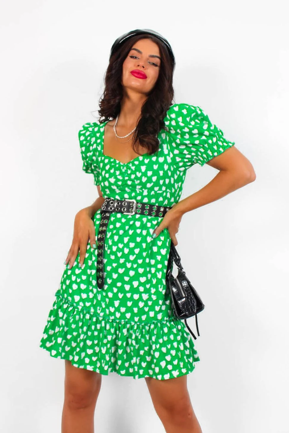 She’s sweet… but watch her wild side. Blooming with a bold green and white love heart pattern, this romantic heart print mini dress features puff sleeves, a sweetheart neckline and a ruffled hemline detail. Keep it cute in a statement stiletto boot for casual outings, or add killer heels for brunch with the Dolls.